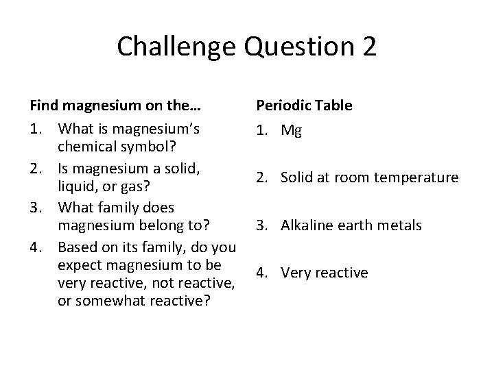 Magnesium Oxide from chemistry.elmhurst.edu Magnesium is a shiny gray solid which bears a close physical resemblance to the other five elements in the second column (group 2, or alkaline earth metals) of the periodic table: Synonyms, crossword answers and other related words for chemical symbol for magnesium mg. Magnesium is an alkaline earth metal and the seventh most abundant element in the earth's crust. 'chemical symbol for magnesium' is a 26 letter phrase starting with c and ending with m. Through the following link, you can find a list of foods with magnesium. There you can find the metals. It is a shiny gray solid which bears a close physical resemblance to the other five elements in the second column (group 2, or alkaline earth metals) of the periodic table: Our magnesium page has over 360 facts that span 117 different quantities.